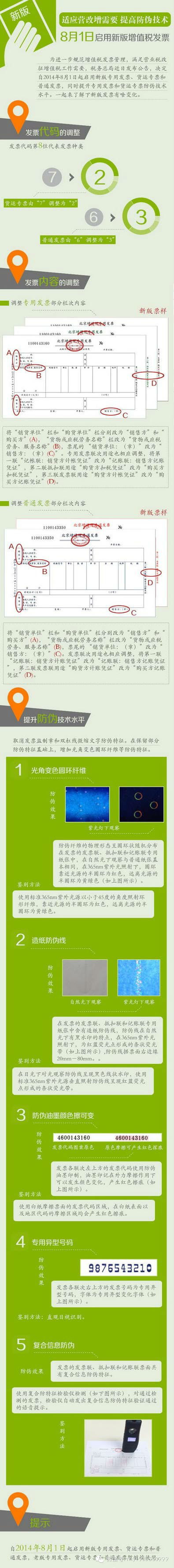 为进一步规范增值税发票管理,满足“营改增”工作需要,税务总局近日发布公告,决定自2014年8月1日起启用新版专用发票、货运专票和普通发票,同时提升专用发票和货运专票防伪技术水平。新政策,新变化,小伙伴们一定要奔走相告哦!